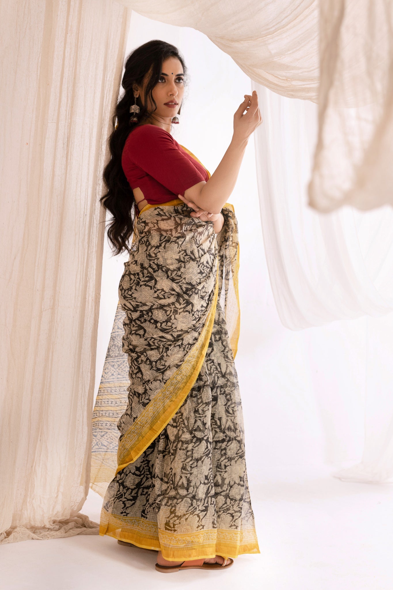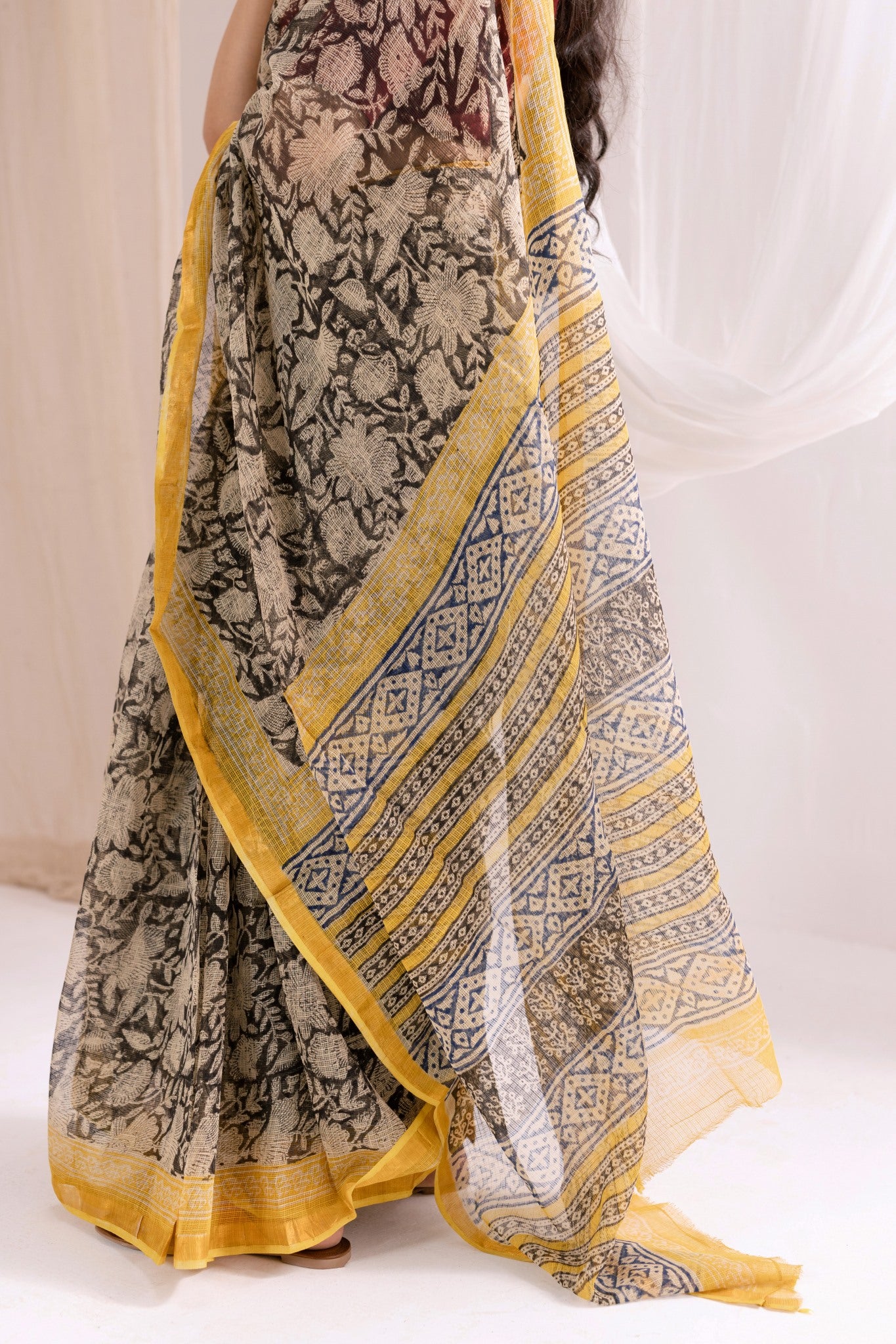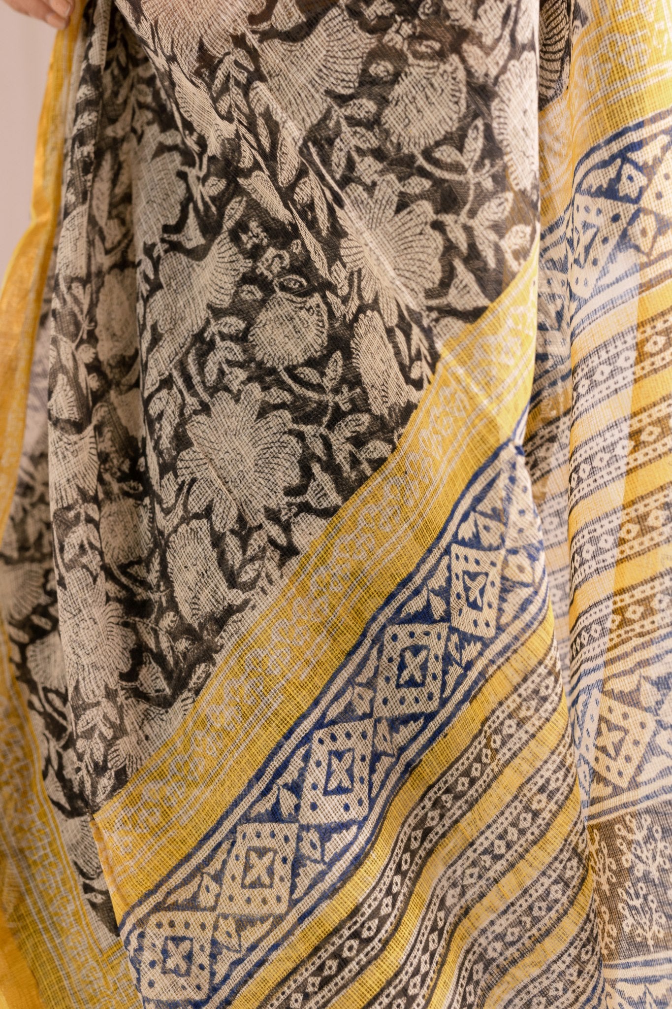 Yellow - Kota Doria Bagru Hand Block Printed Saree